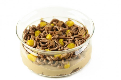 Γκοφρέτα πραλίνας Valrhona, namelaka σοκολάτα γάλακτος Valrhona, crémeux σοκολάτα υγείας Valrhona και ζελέ μάνγκο.